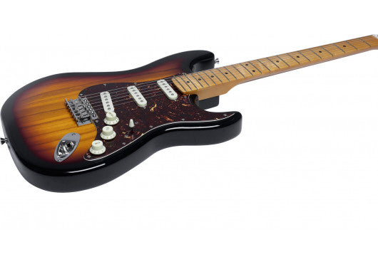 La ST401 est une guitare électrique au design vintage intemporel inspiré des modèles emblématiques des années 1950, pensée pour offrir aux guitaristes débutants une expérience à la fois confortable, polyvalente et accessible. Son corps en paulownia léger et résonant, associé à un manche vissé en érable américain surmonté d’une touche assortie, garantit une lutherie soignée, robuste et agréable au jeu. Côté électronique, elle embarque trois micros simple bobinage pilotés par un sélecteur 5 positions, permettant une large palette sonore allant des sons clairs et veloutés aux saturations plus mordantes, idéale pour explorer différents styles musicaux. Son vibrato classique, ses pontets réglables et sa plaque de protection au look vieilli complètent une configuration efficace et esthétiquement réussie. Avec sa silhouette rétro à double échancrure, sa finition soignée et son prix abordable, la ST401 combine élégance, ergonomie et performance pour accompagner les premiers pas des guitaristes avec style et fiabilité.