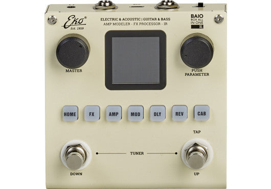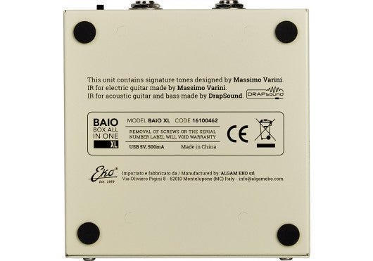 La BAIO XL (Box All In One) est une pédale d’effets compacte qui concentre toute la puissance d’un pédalier professionnel dans un seul boîtier. Compatible guitare électrique, acoustique et basse, elle propose 80 préréglages (40 d’usine + 40 utilisateur) entièrement personnalisables pour créer votre son unique. Ses 6 modules d’effets modulables — Noise Gate, Boost, Compresseur, égaliseur 3 bandes, 20 modèles d’amplis, modulations, délais et réverbérations — offrent un arsenal complet à portée de pied. Sa technologie Impulse Response (IR), développée avec Massimo Varini et la bibliothèque DrapSound, garantit un son naturel, riche et inspirant, digne des meilleures scènes et studios.