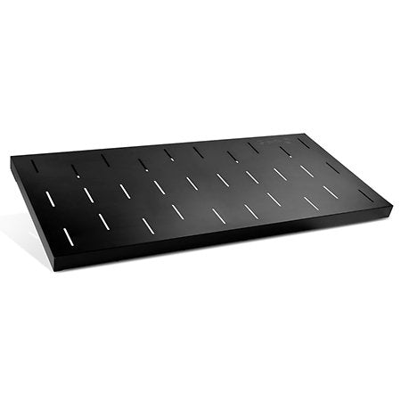 Le plateau KS RD1, conçu pour s’installer facilement sur le stand, offre une surface généreuse de 1000 x 480 mm avec des fentes de ventilation pour préserver les équipements. Sa finition thermolaquée noire garantit une excellente résistance et il supporte jusqu’à 60 kg.