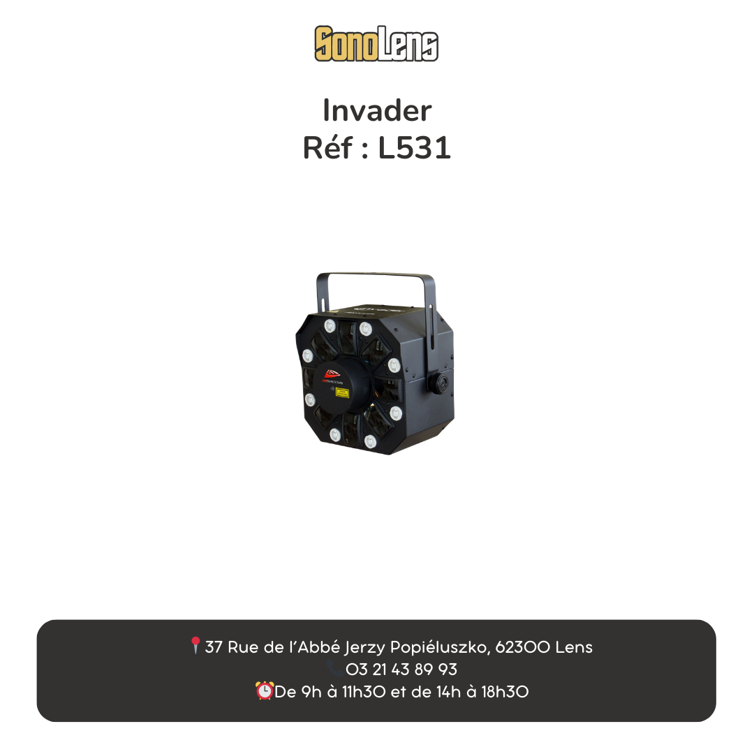 Disponible en location chez Sonolens, le JB Systems Invader regroupe effet LED, laser et stroboscope dans un seul appareil pour un rendu lumineux complet et impactant.