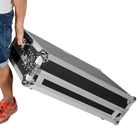 Flight case spécialement conçu pour le contrôleur Pioneer DJ DDJ-FLX-10, en finition Silver, équipé d’un support pour ordinateur portable et de roulettes intégrées pour un transport facile et sécurisé.